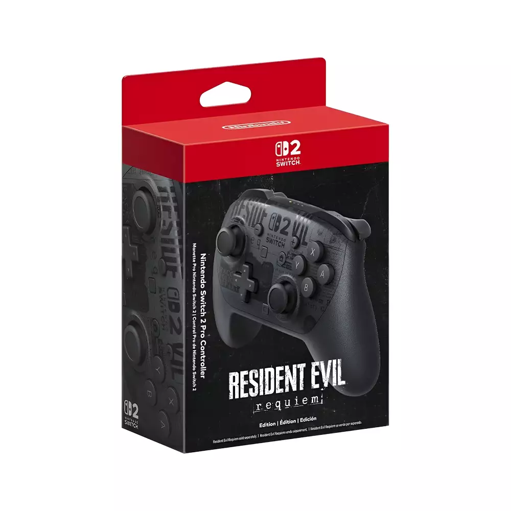 Includes USB-C charging cable Nintendo Switch 2 Pro Controller Resident Evil Requiem Edition Take your gaming to the next level with the Nintendo Switch 2 Pro Controller Resident Evil Requiem Edition, featuring a gunmetal-black visual design with in-world newspaper articles that capture the dark and immersive atmosphere of Resident Evil Requiem. Features: HD rumble 2 Motion controls Built-in amiibo functionality Capture Button C Button for GameChat GL/GR buttons that you can map to any button you choose. Audio jack – 4 pole stereo 3.5mm mini plug (CTIA standard)