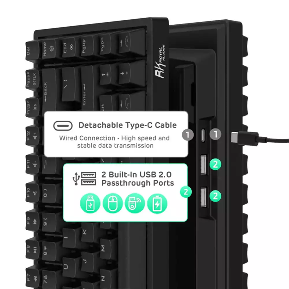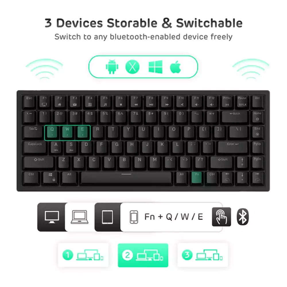 Maximize your desk space without sacrificing functionality with the RK84 Tri-Mode Mechanical Keyboard. Featuring a streamlined 75% layout (84 keys), it retains the function row and dedicated arrow keys while offering a much smaller footprint than a full-size keyboard.